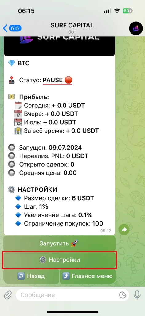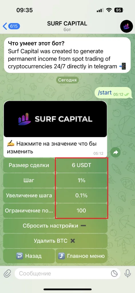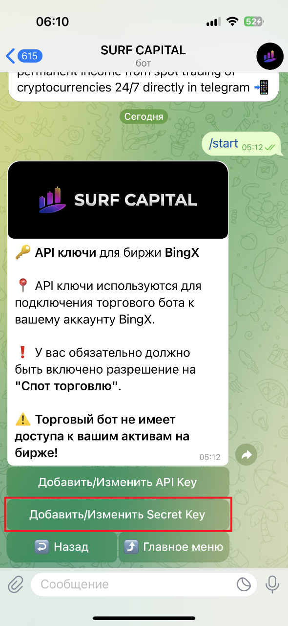 Внимание, торговый бот Surf Capital не имеет доступа к вашим средствам. Все средства хранятся на вашем биржевом счете/кошельке.
