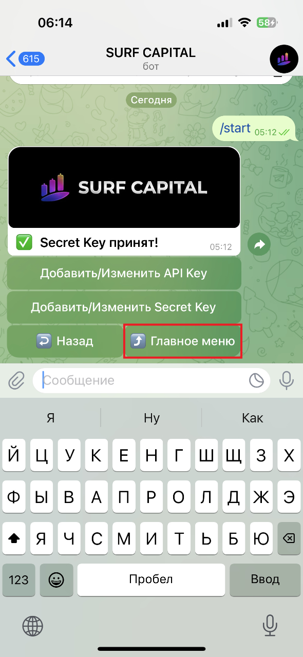 API ключи приняты! После добавления ключей возвращаемся в «Главное меню».