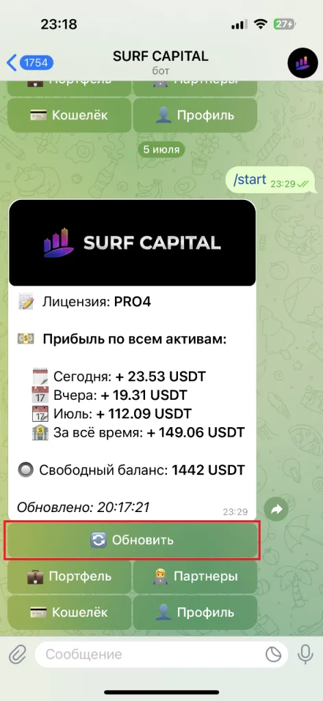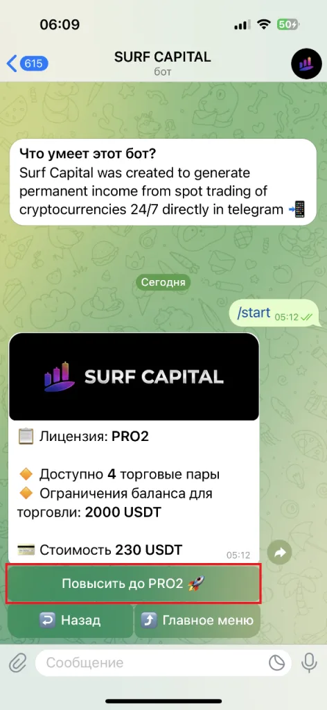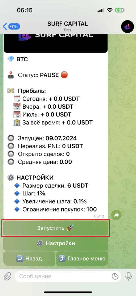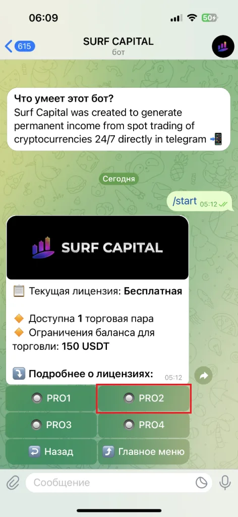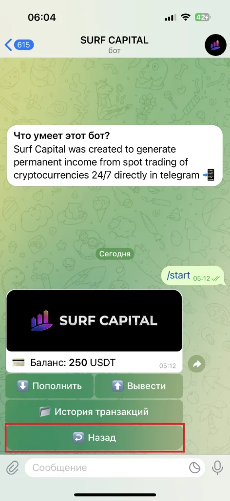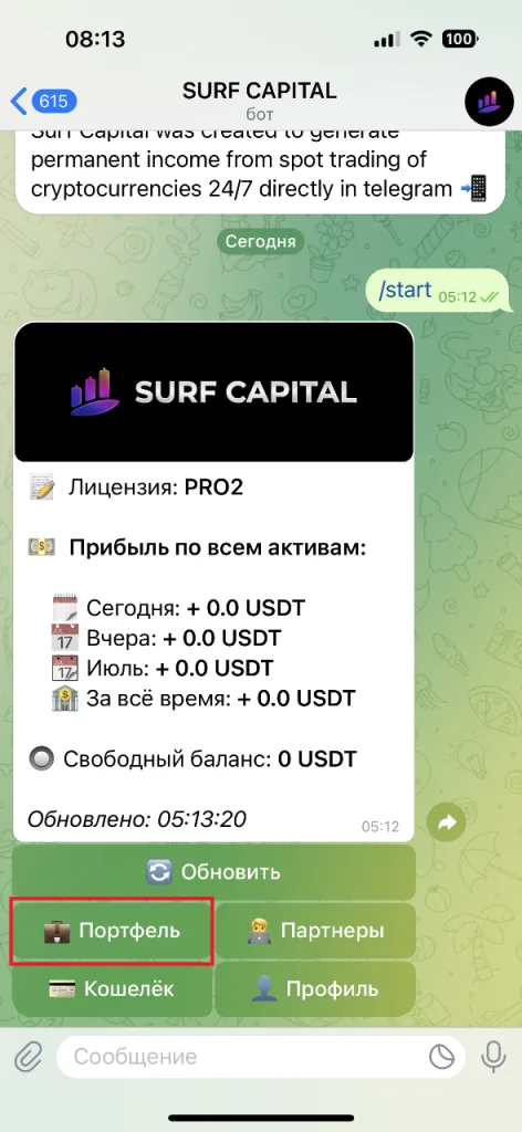 Запуск Surf Capital в телеграмм. Переходим по реферальной ссылке и нажимаем кнопку «Начать». Как запустить Surf Capital
