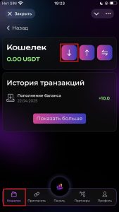 В главном меню выберите пункт “Кошелёк” и нажмите “Пополнить”.